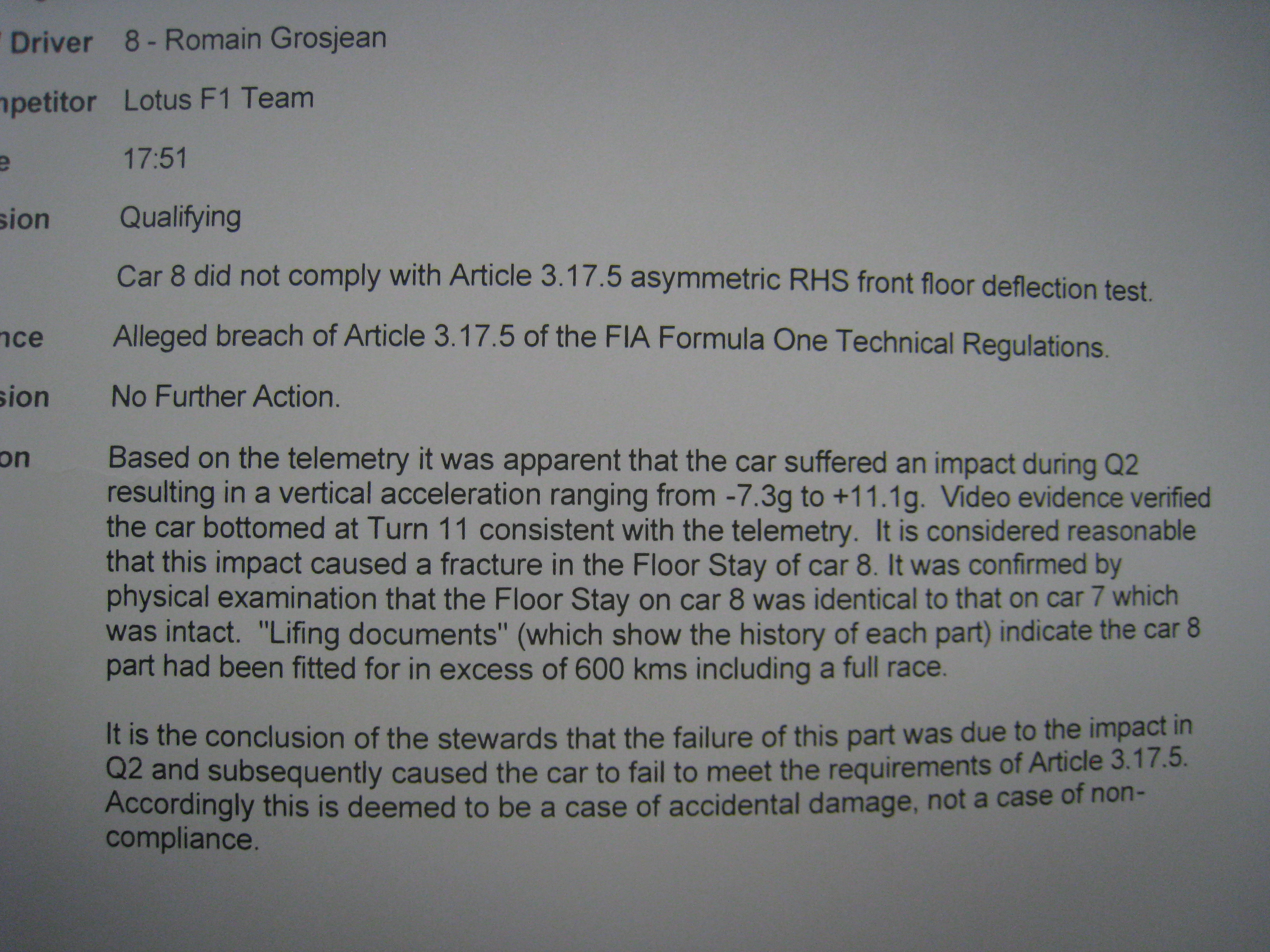 They accepted that the floor stay was broken after a high vertical loading was caused by hitting a kerb at Turn 11. In fact it was deemed to have ranged from -7.3g to + 11.1g.